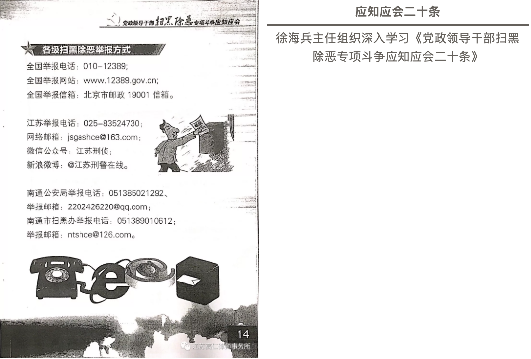 根据“扫黑除恶”相关文件精神,我所还成立了“扫黑除恶”专项法律服务工作小组,由徐海兵主任担任组长,党支部书记曹翠萍、合伙人吴媛媛、范佳茜担任副组长。
