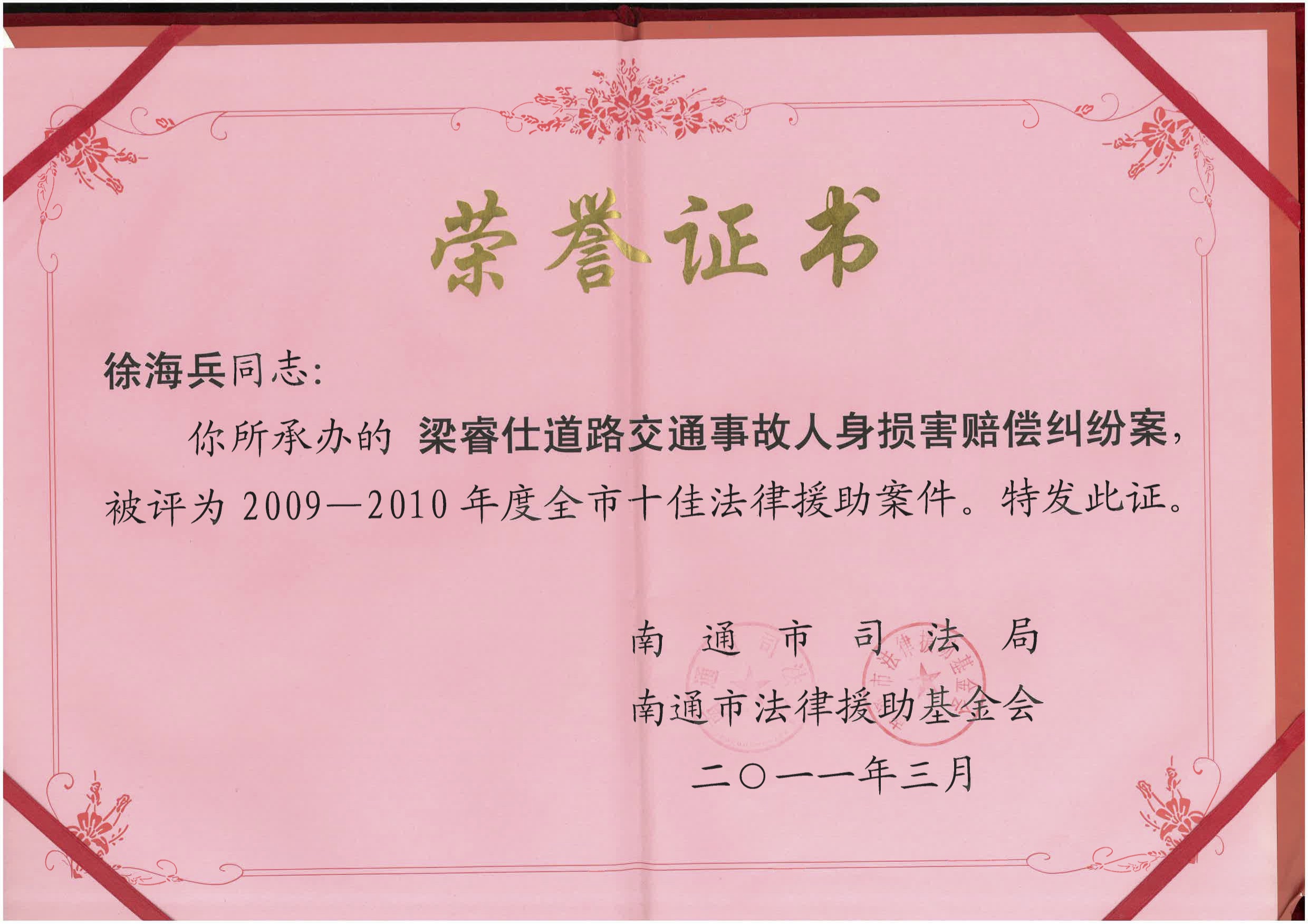 我所曾先后被中共南通市委、南通市人民政府评为“文明单位”,在律师行业诚信体系建设工作中被南通市律协评为“先进单位”,被江苏省司法厅、江苏省律师协会授予“江苏省优秀律师事务所”等荣誉称号。